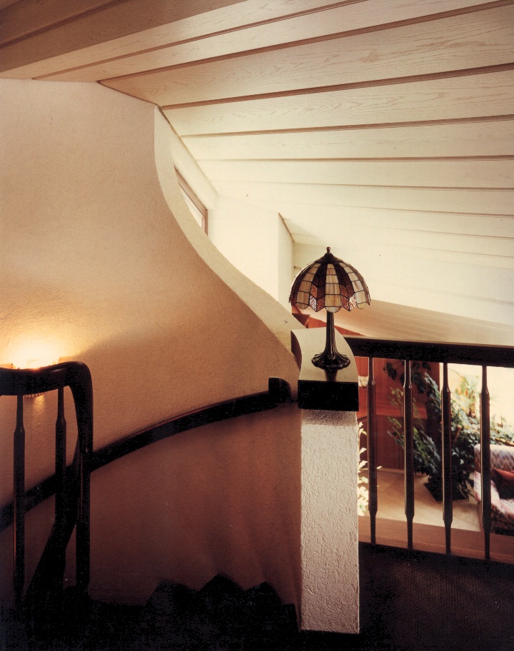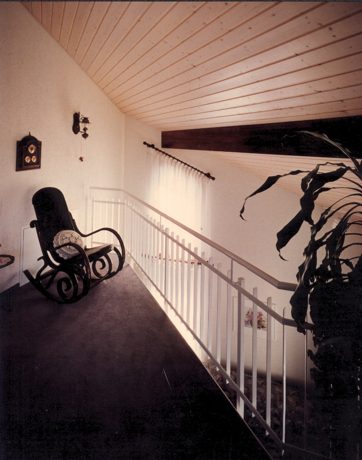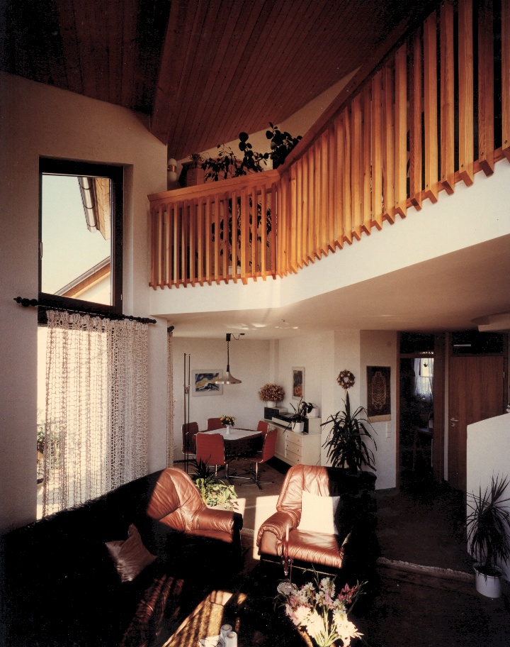 Im Innenraum sind es Gemeinschaftsbereiche die fliesend in Rückzugsbereiche übergehen. Ein Schaukelstuhl findet Platz auf einer Empore oder in einer Leseecke. Bei Gelegenheit wird der Blick in die Ferne oder auf einen attraktiven Gartenbereich gelenkt.